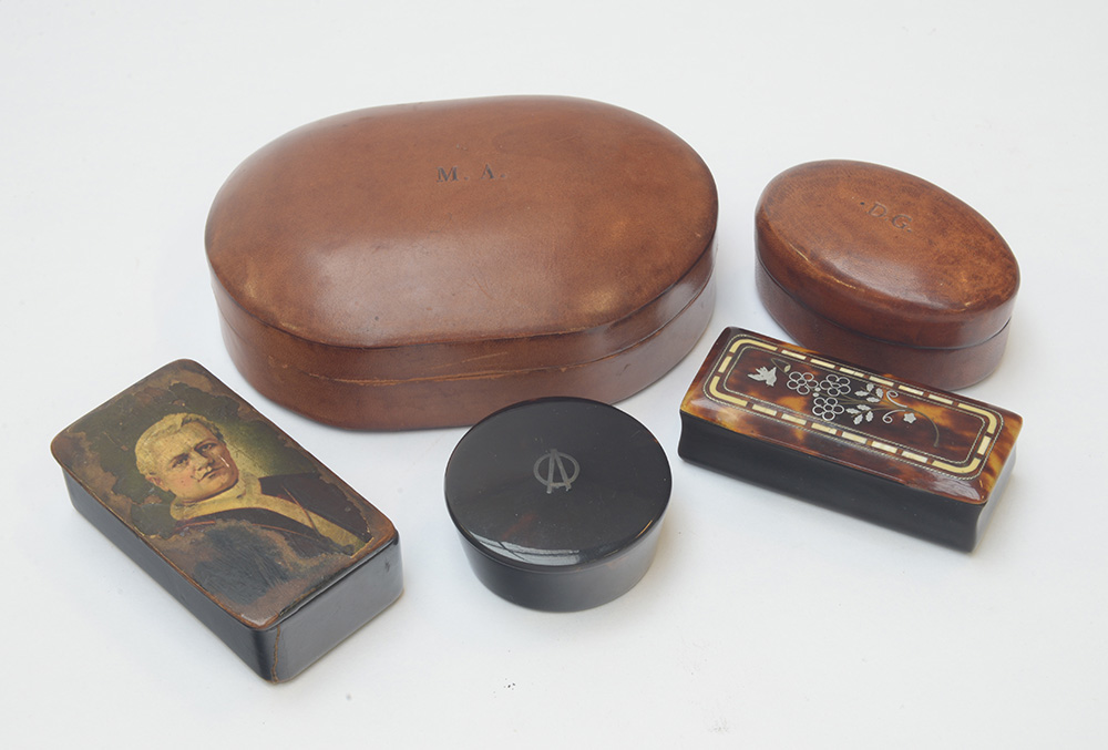 Lotto composto da due scatole di misura diversa, rivestite in pelle e monogrammate unite a tre tabacchiere in materiali diversi, misure e decori differenti (difetti)