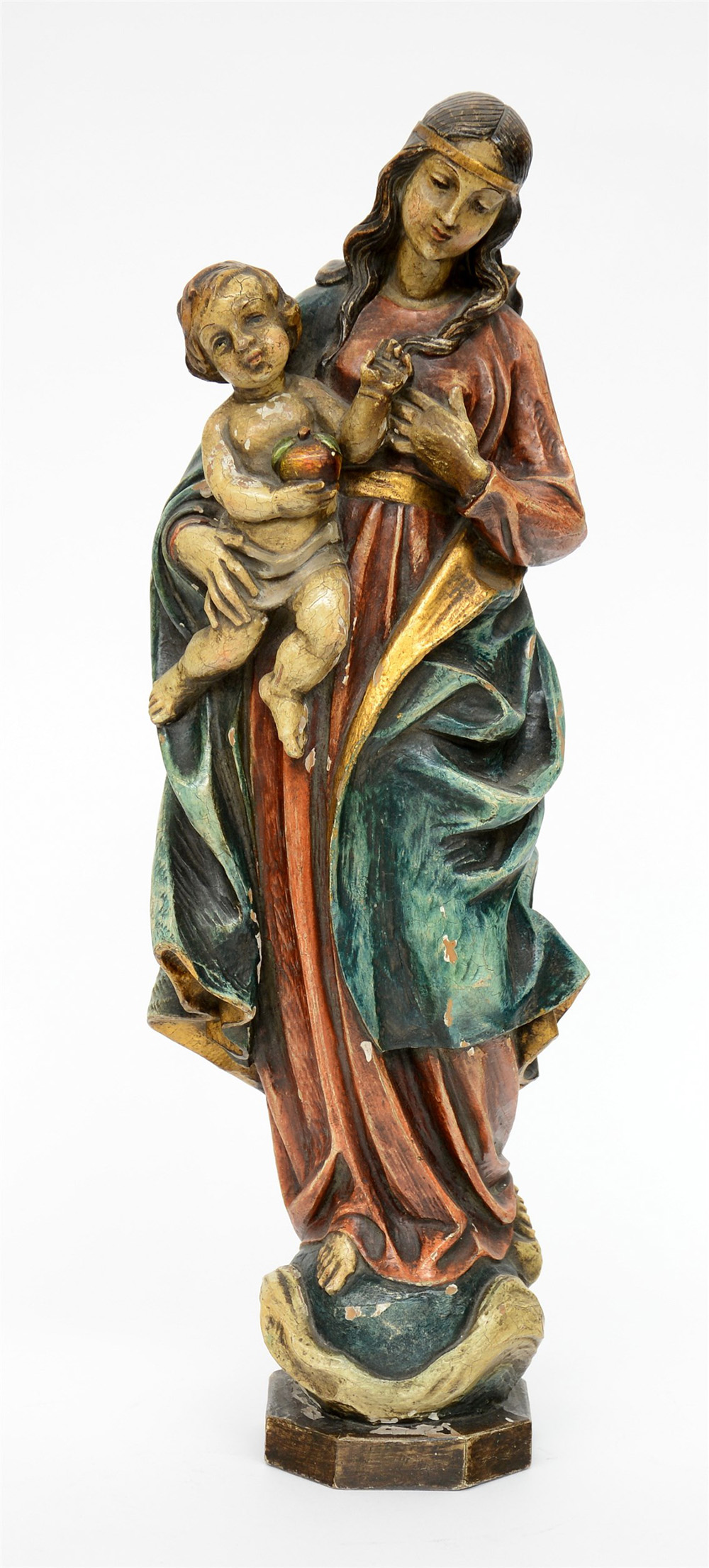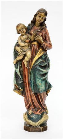Scultura in legno intagliato e dipinto in policromia raffigurante la Vergine con Bambino (h cm 48) (difetti)