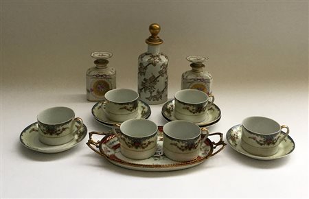 Lotto di porcellane composto da sei tazze da tè con piattini, tre contenitori con tappi e un vasetto biansato con ringhiera in metallo dorato, manifatture differenti (lievi difetti)