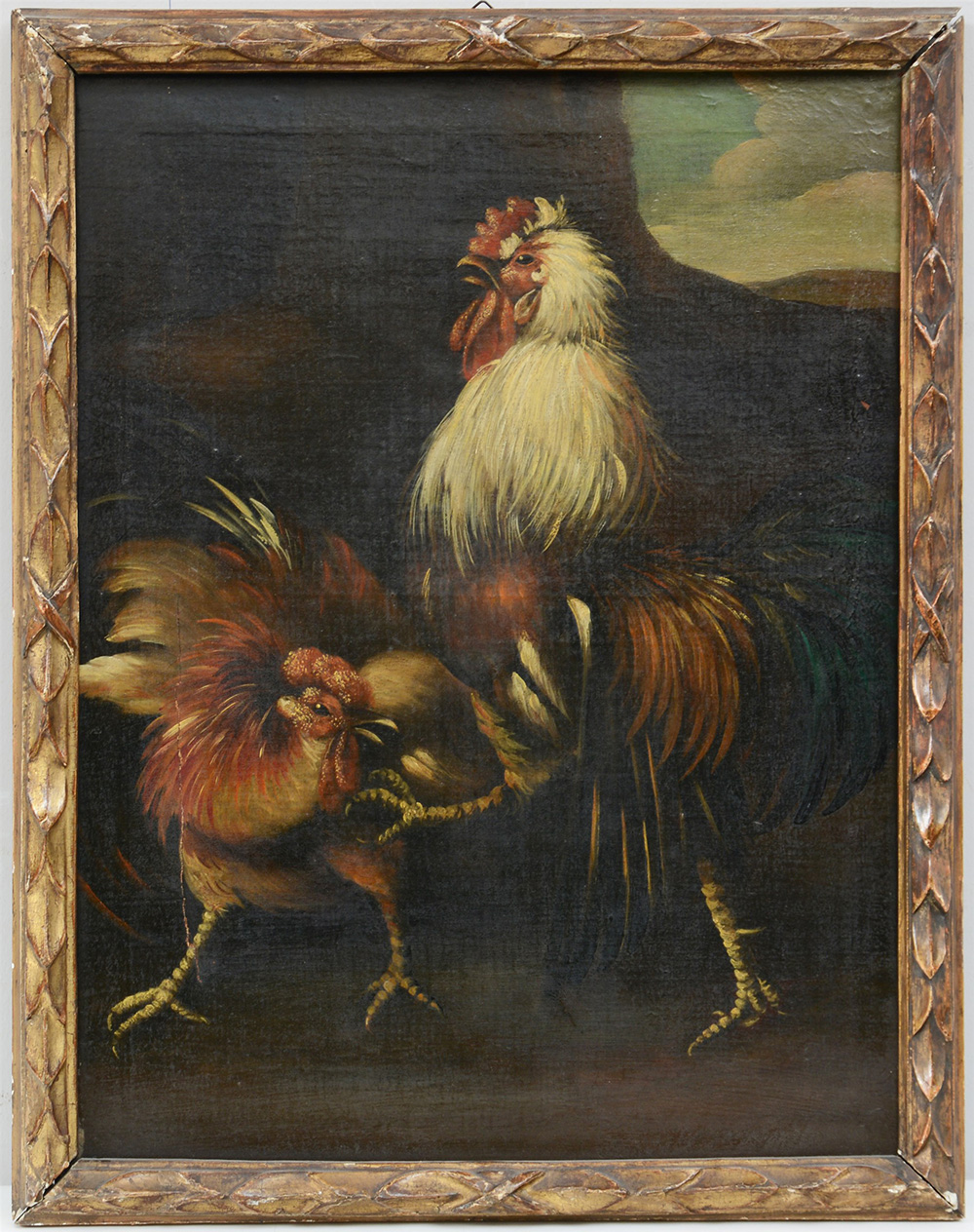 Scuola del secolo XVIII "Combattimento di galli" olio su tela (cm 62x48) in prima tela. In cornice (strappo)