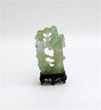 Gruppo di figure femminili in quarzo verde su base in legno (difetti)Cina,...