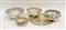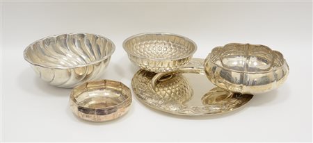 Lotto composto da un sottopiatto e quattro ciotole in argento (d. sottopiatto cm 31, d. max ciotola 23,5) (g 2000 ca.) (lievi difetti)