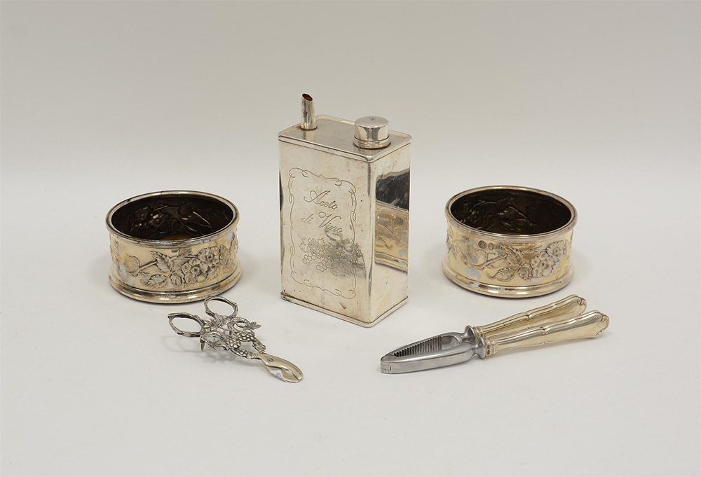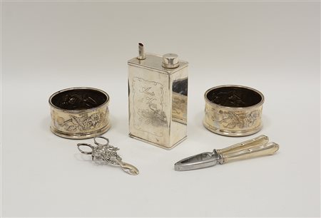 Lotto composto da due sottobottiglia Brandimarte, una latta, un tagliauva e uno schiaccianoci in argento con fondelli in legno e aderenza in acciaio (g 360 ca.)
