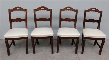 Gruppo di quattro sedie in noce con schienale a giorno e cartelle sagomate, gambe mosse. Sec. XIX