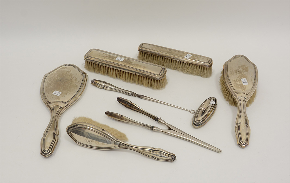 Servizio da toilette composto da quattro spazzole, uno specchio a mano, un tiralacci, una pinza per guanti e un attrezzo da cucito con manici e coperture in argento
