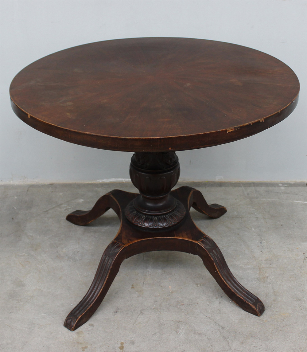 Tavolo tondo con gamba centrale tornita e intagliata con teste di cherubini poggiante su base terminante a quattro piedi sagomati e scanalati (d cm 95x74)(difetti)