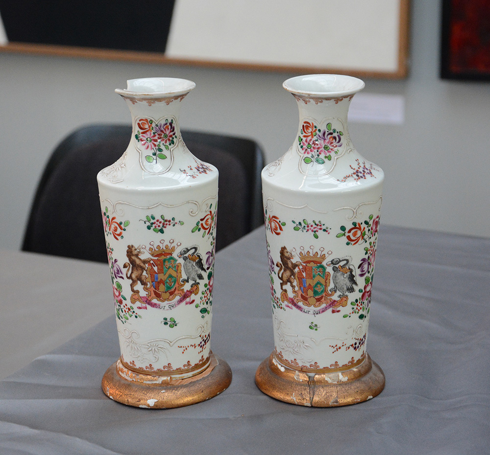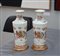 Manifattura di Samson, coppia di vasetti in porcellana decorati con dorature, fiori e stemma araldico su basi in legno dorato (h cm 19) secolo XIX (gravi difetti)