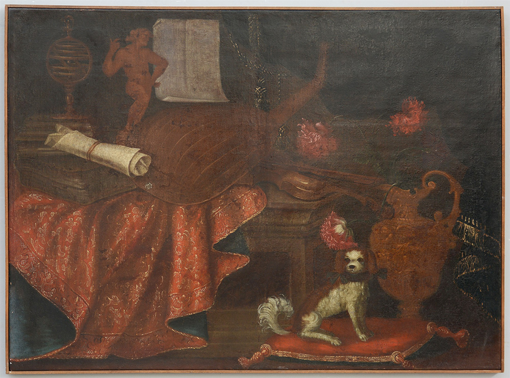 Ambito di Francesco Fieravino "Natura morta con strumenti musicali, spartiti e cagnolino" olio su tela (cm 91,5x123,5) (molti restauri)