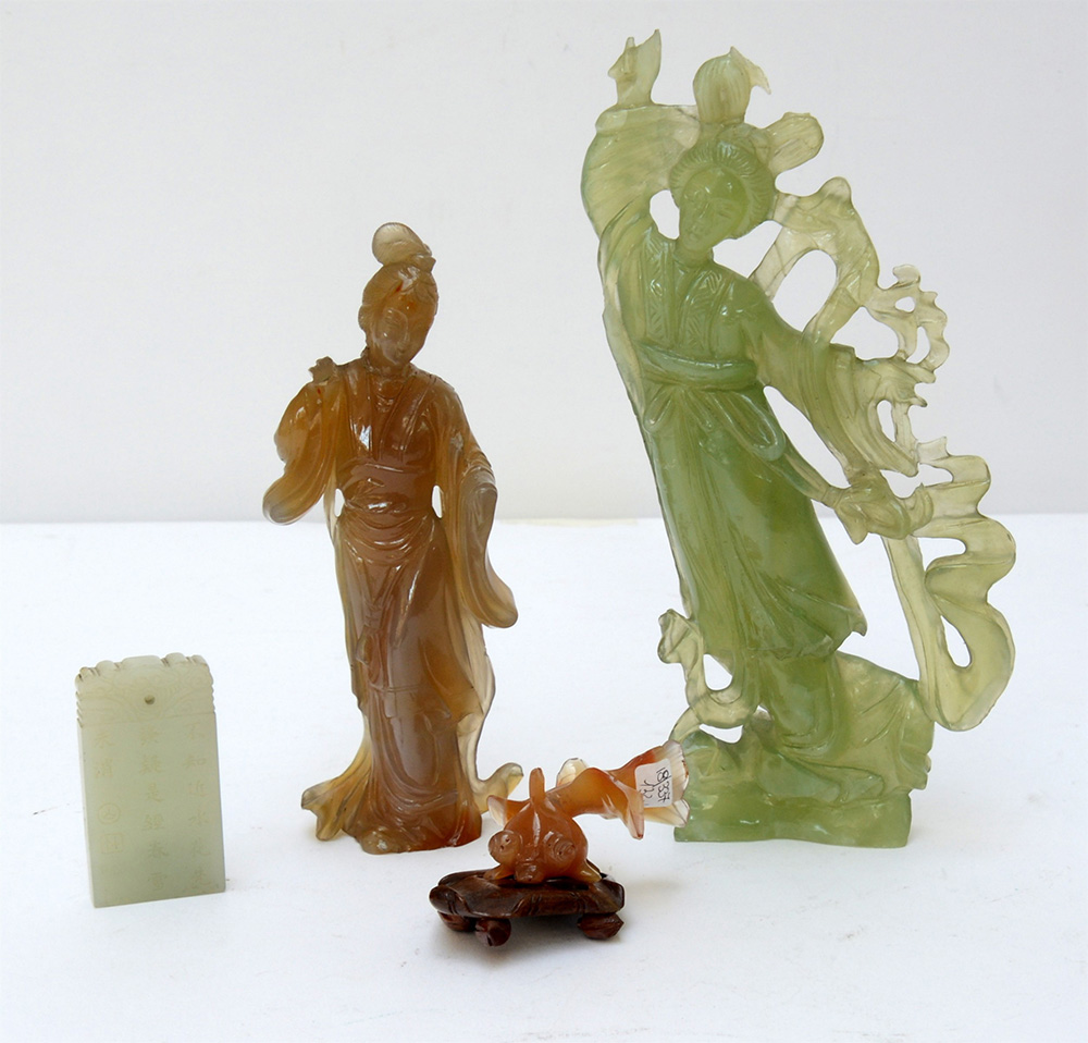 Lotto composto da sculture in vari materiali tra cui una tavoletta in giada con iscrizioni, figure e un pesce, misure diverse (difetti)