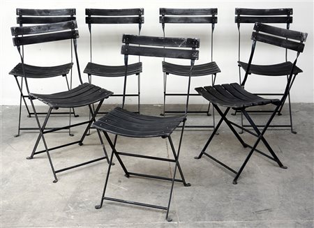 Gruppo di sei sedie pieghevoli modello "Celestina". Produzione Zanotta, Milano, 1978. Struttura in acciaio, schienale e sedile a doghe rivestite in plastica nera. (cm 42x82x50) (gravi difetti)