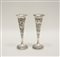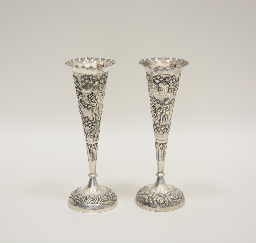 Coppia di vasetti portafiori in argento sbalzato con scene di vita entro paesaggio tropicale, manifattura asiatica sec. XX (gr 300 ca.) (h cm 19) (difetti)