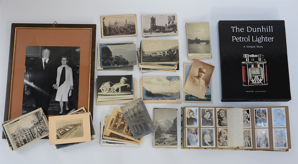 Scatola contenente numerose cartoline perlopiù viaggiate, un album con cartoline e fotografie di Greta Garbo, una pubblicazione sugli accendini da collezione, ed una fotografia in cornice ritraente Alfred Hitchcock con la moglie Alma Reville (difetti)