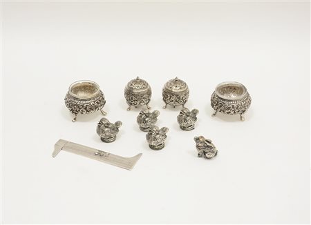 Lotto composto da otto salini, un calibro e un animaletto in argento (g 420 ca.)