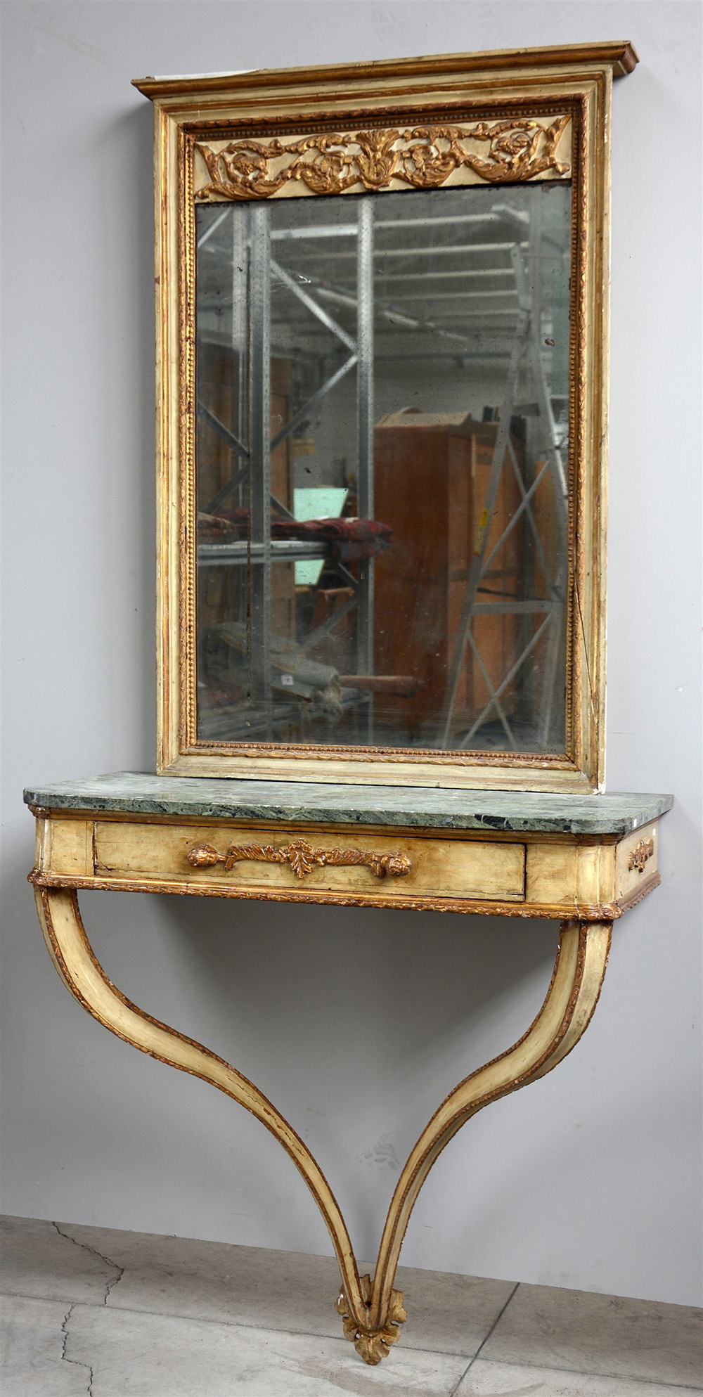 Console con specchiera separata in legno intagliato, laccato bianco e parzialmente dorato con cassetto nella fascia, piano in marmo (console cm 91x93x40, specchiera cm 80x113) (difetti)