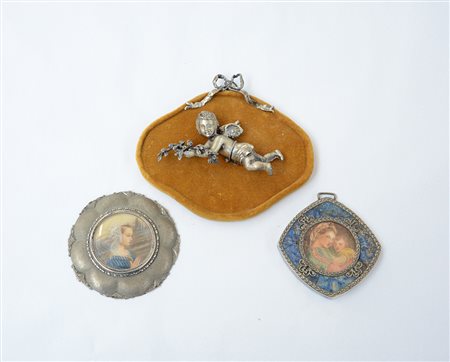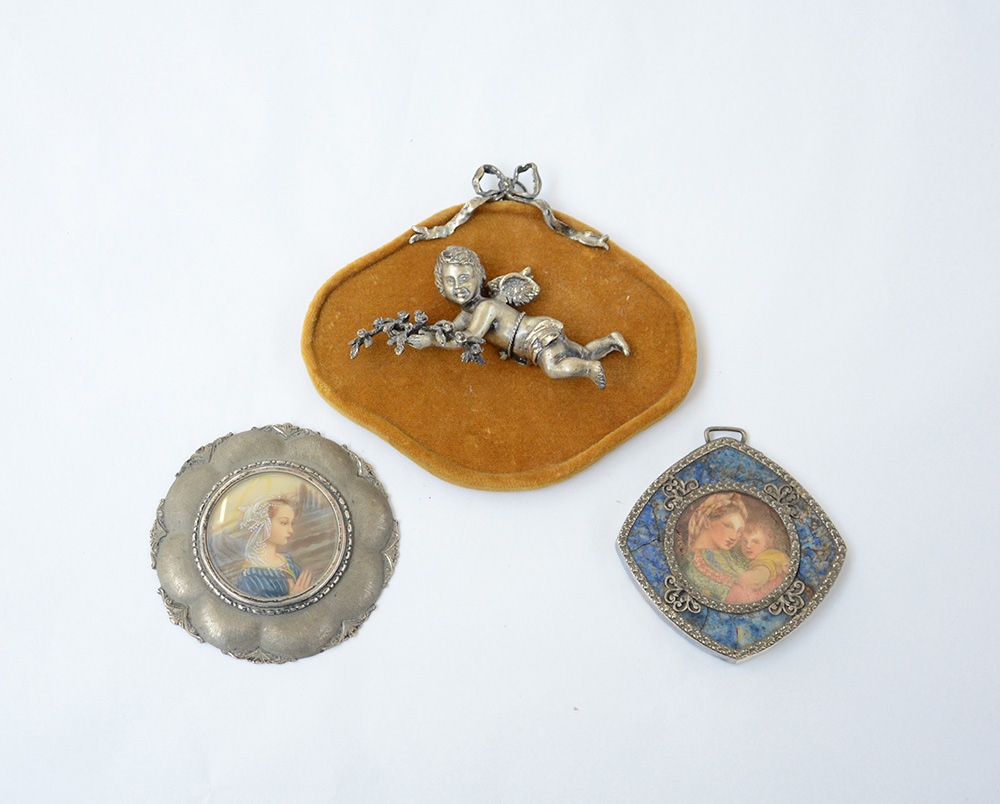 Lotto composto da due miniature con cornici in argento e lapislazzolo ed un fregio raffigurante un angelo in argento su pannello (difetti)