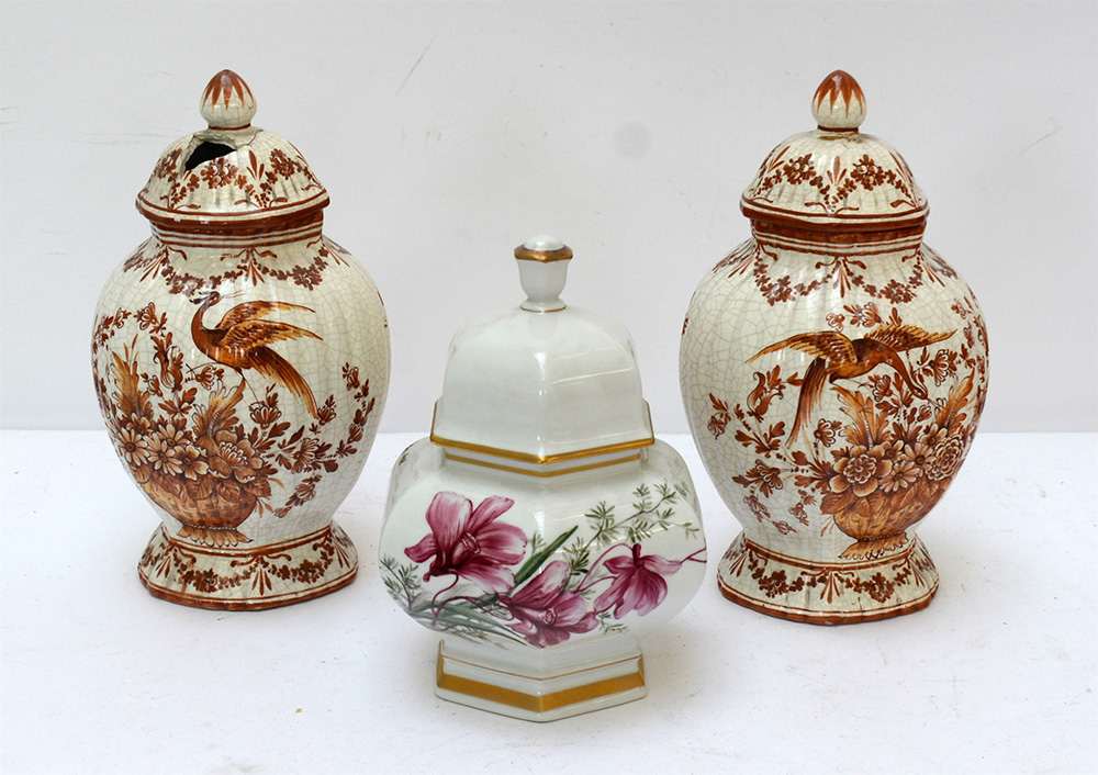 Lotto composto da due potiches in ceramica craquelé di Bassano con decoro monocromo a soggetto naturalistico e una esagonale di manifattura tedesca (h max cm 25) (difetti)