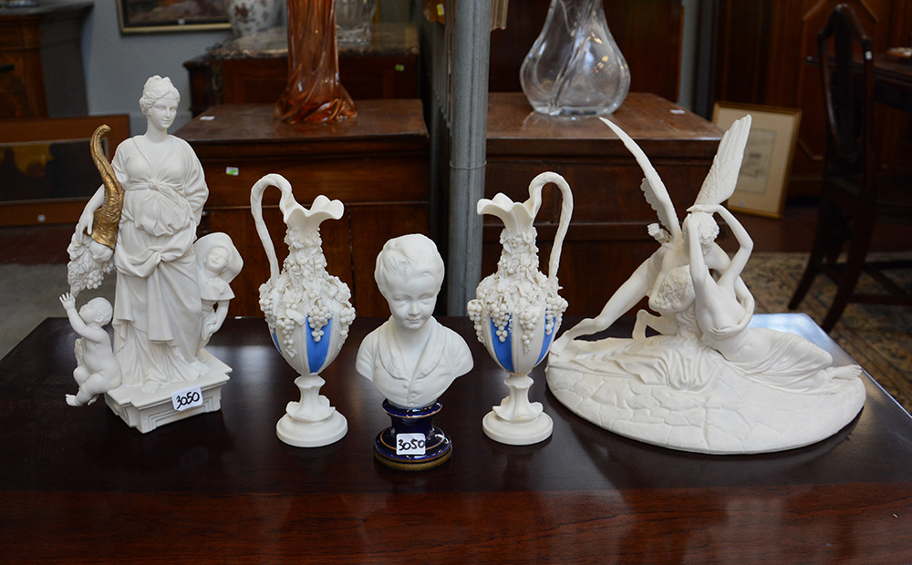 Manifatture diverse, lotto composto da due gruppi plastici, due brocche ed un busto di bimbo in biscuit. Misure diverse (lievi difetti e restauri)