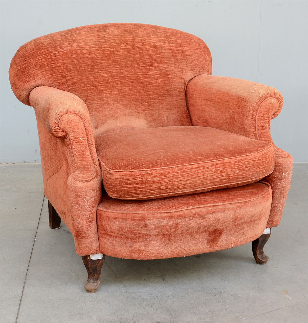 Poltrona di forma mossa rivestita in velluto color mattone (difetti)