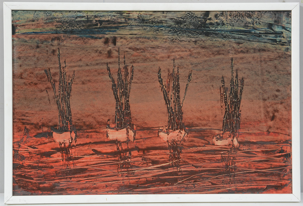 Firma indecifrata, "Barche" tecnica mista su tela (cm 47x71) siglata e datata 1969 in basso a destra, in cornice