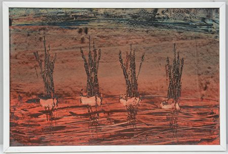 Firma indecifrata, "Barche" tecnica mista su tela (cm 47x71) siglata e datata...