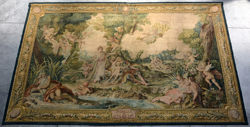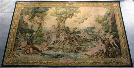 Succo d'erba, inizio secolo XX. Arazzo raffigurante l'episodio di Armida e Rinaldo in un paesaggio bucolico in riva ad un fiume con ninfa e putti. Firmato in basso a destra "Telemaco Pergola, Milano" (cm 308x194) (difetti)
