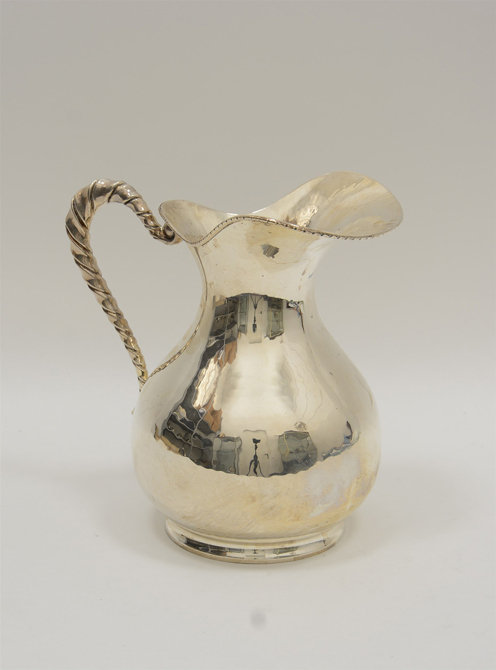 Caraffa in argento con corpo bombato e superficie leggermente martele....