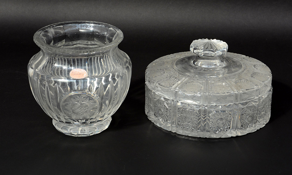 Manifattura di Boemia, lotto composto da un vaso e una biscottiera con coperchio, in cristallo sfaccettato (difetti)