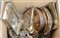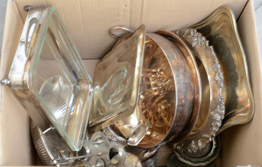 Cartone contenente numerosi oggetti per la tavola in metallo argentato (difetti)