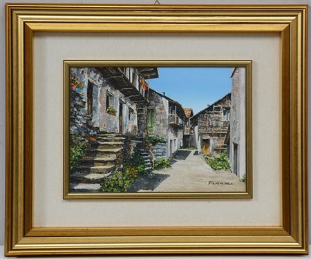 Fugazza "Scorcio con case di montagna" olio su tela applicata su compensato...