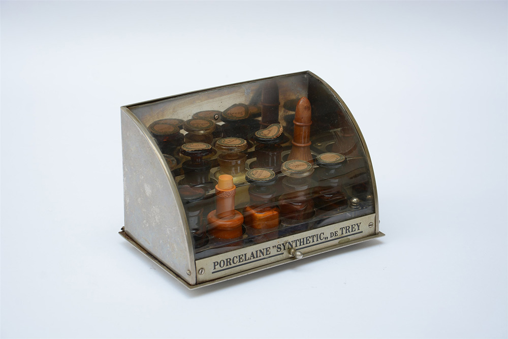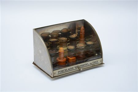 Piccola teca in metallo e vetro iscritta "Porcelaine Synthetic de Trey"...