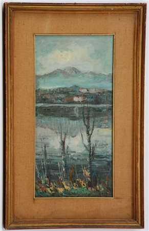 "Lago d'Oggiono" olio su tela (cm 60x30) firmato in basso a destra, controfirmato e titolato al retro, in cornice