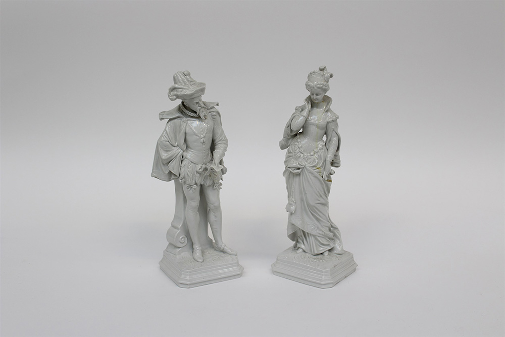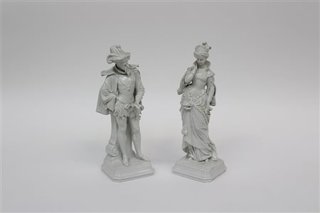 Manifattura italiana, coppia di sculture in porcellana raffiguranti una dama e un gentiluomo (h max cm 42) (difetti e restauri)