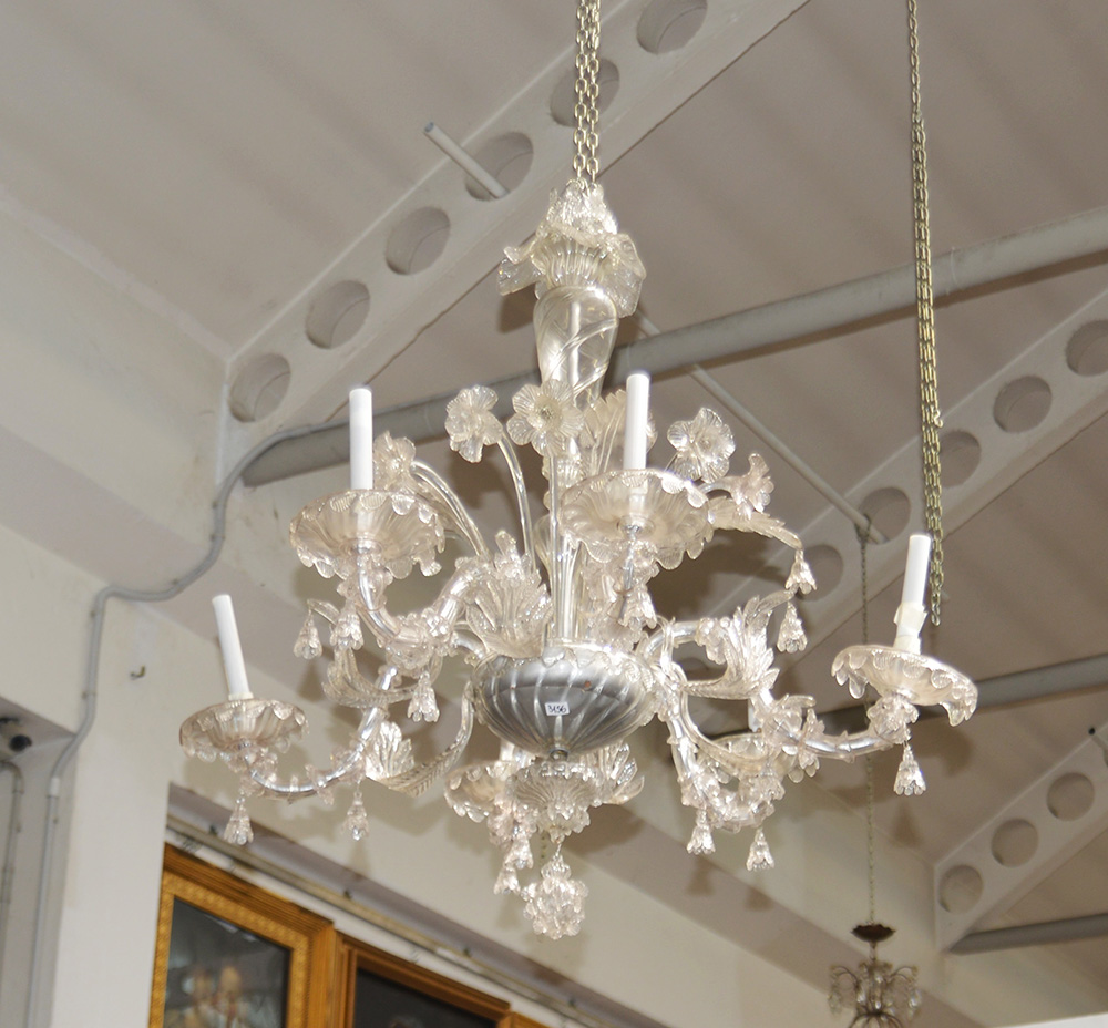 Manifattura di Murano, lampadario a sei braccia in vetro incolore (h cm 105,...