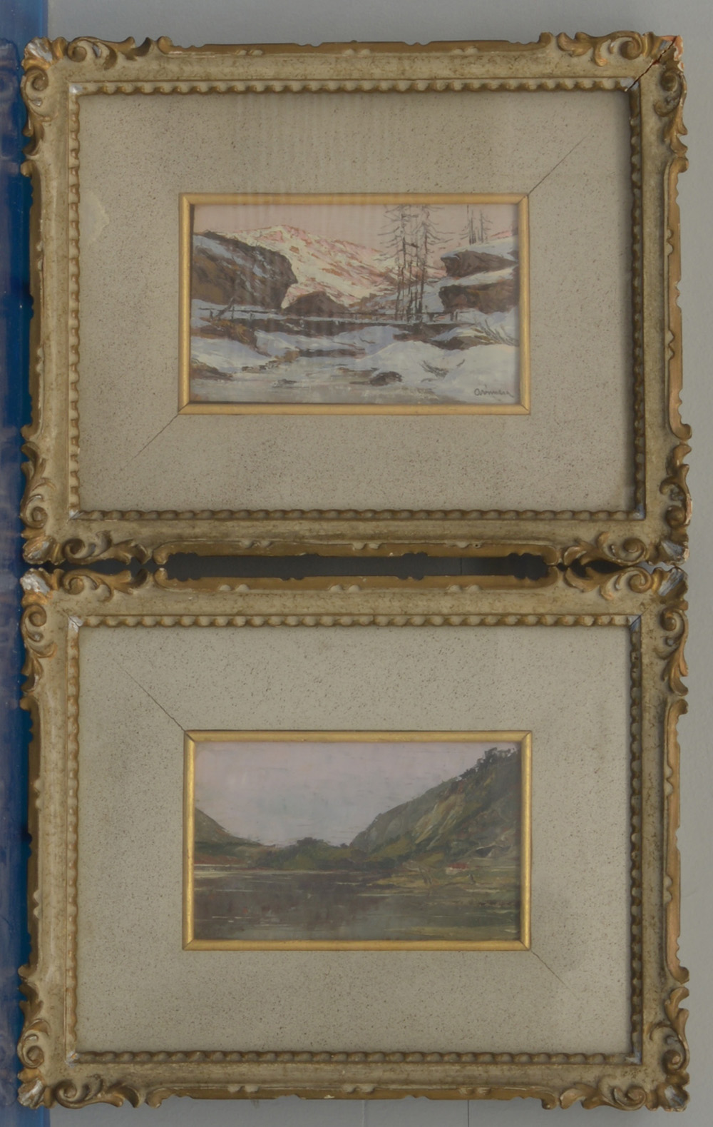 "Lago di Molveno" 1906 e "Paesaggio invernale" coppia di olii su compensato (cm 9,5x15,5) uno firmato titolato e datato al retro, l'altro firmato in basso a destra, in cornici (difetti)