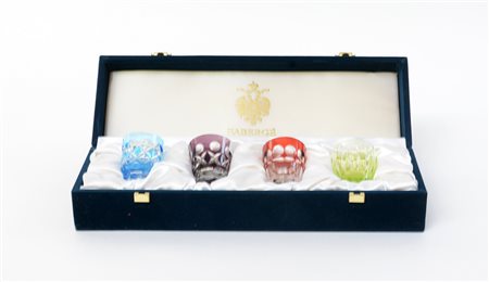 Lotto di quattro bicchieri in cristallo molato di diversi colori. Esecuzione recente. In scatola Fabergé non pertinente.