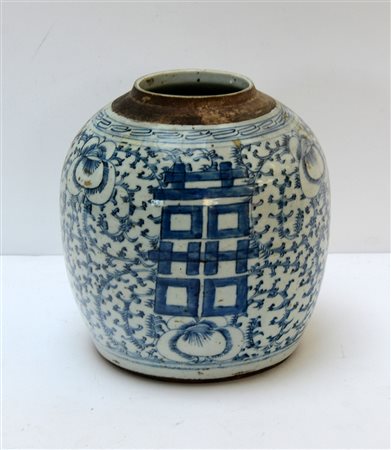 Vaso in porcellana bianca e blu decorato con fiori a doppio "xi", base in...