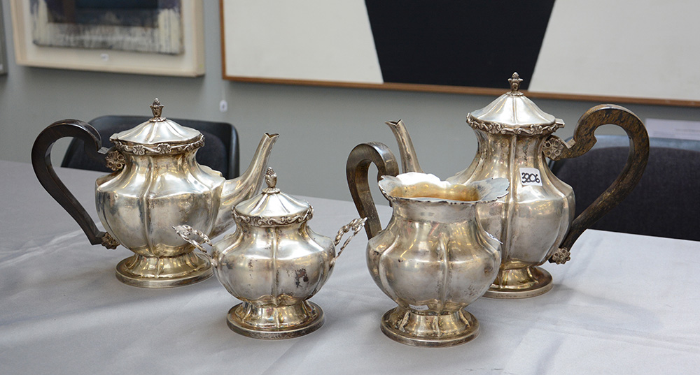 Servizio da te e caffè composto da caffettiera, teiera, lattiera e zuccheriera con corpi a balaustro decorato a baccellature e costolature verticali con bordura a volute fogliate. Manici a voluta in legno. Italia, fine secolo XIX-inizi XX (h. max cm21) (g lordi 1980 ca.) (difetti)