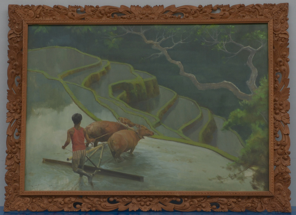 Firma indecifrata, "Bali - Risaie a terrazzo" 1977 olio su tela (cm 70x100) firmato datato in basso a sinistra, in cornice intgliata (difetti)