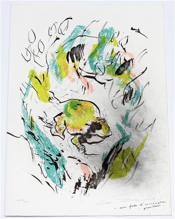 "Senza titolo" litografia (cm 47,5x35) numerata XXVIII/XXX e firmata in basso a matita. Stampata sul fronte di un quartino ad illustrazione del Decameron di Boccaccio (le seconde venti novelle) Edizioni Teodorani, Milano, 1986/87