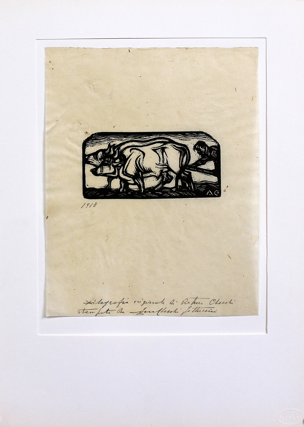 "Senza titolo" 1918, xilografia stampata su carta di riso (cm 28x22 il foglio) siglata nella tavola in basso a destra e datata a matita in basso a sinistra. Iscritta e firmata nel margine inferiore del foglio.