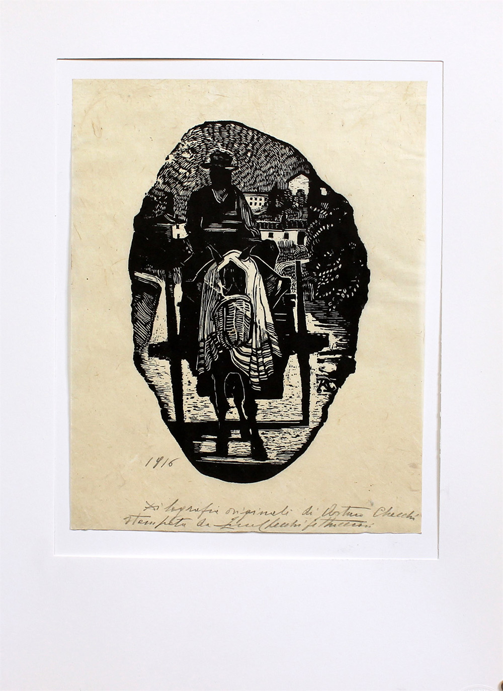 "Senza titolo" 1916, xilografia stampata su carta di riso (cm 28x22 il foglio) e datata a matita in basso a sinistra. Iscritta e firmata nel margine inferiore del foglio.