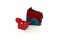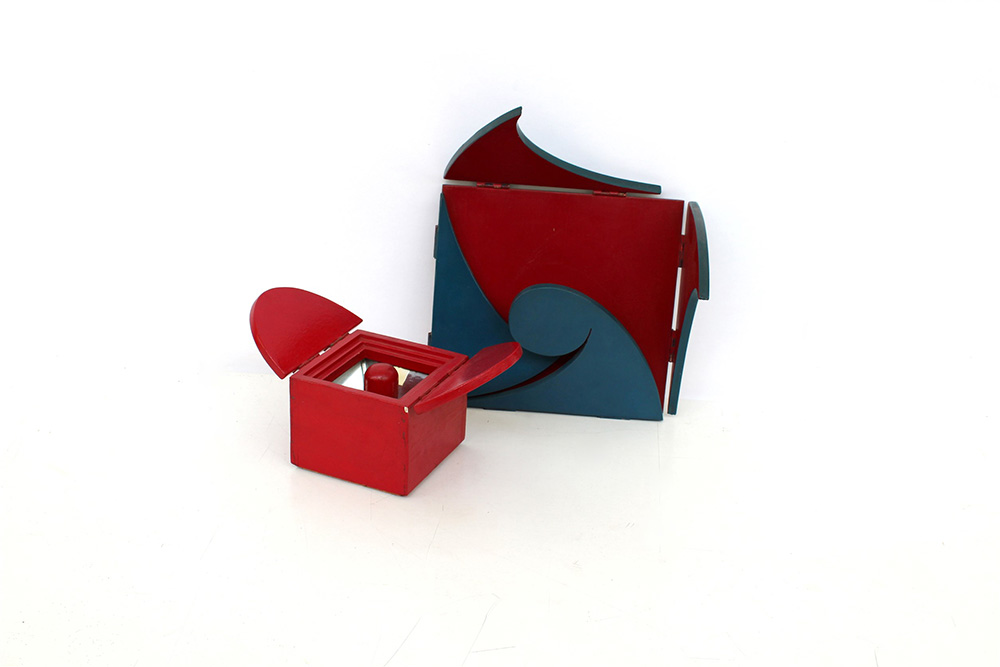 Due piccole sculture-oggetto in legno dipinto in rosso e blu. Un esemplare firmato e datato 71 al verso (difetti)