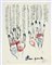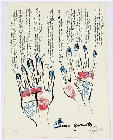"Senza titolo" litografia a colori (cm 47,5x35) numerata XXVIII/XXX e firmata in basso a matita. Stampata sul fronte di un quartino ad illustrazione del Decameron di Boccaccio (le prime venti novelle). Edizioni Teodorani, Milano, 1975.