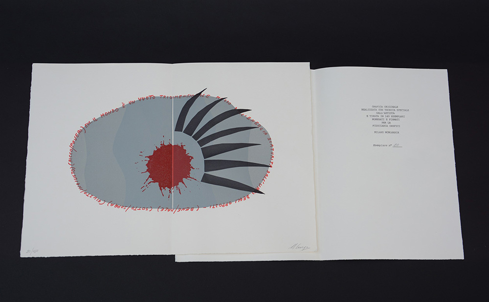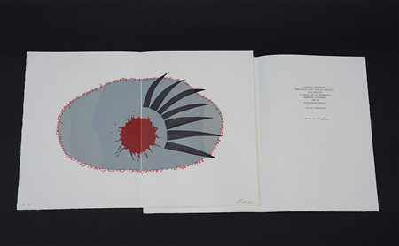 "Proteo" cofanetto editoriale contenente una grafica originale dell'artista, numerata 20/140 e firmata a matita (cm 34,5x50) e un racconto dell'autore stampato su fogli sciolti, Mercato del Sale, "Edizioni rare", Milano, 1989 (lievi difetti)