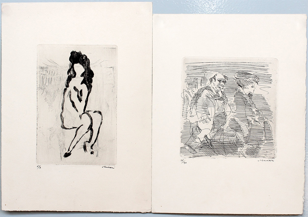 lotto composto da un acquaforte raffigurante due figure (lastra cm 17x16) numerata 26/40 e firmata in basso a matita e una puntasecca raffigurante una fanciulla (lastra cm 20,2x13,5) numerata 6/7 e firmata in basso a matita.