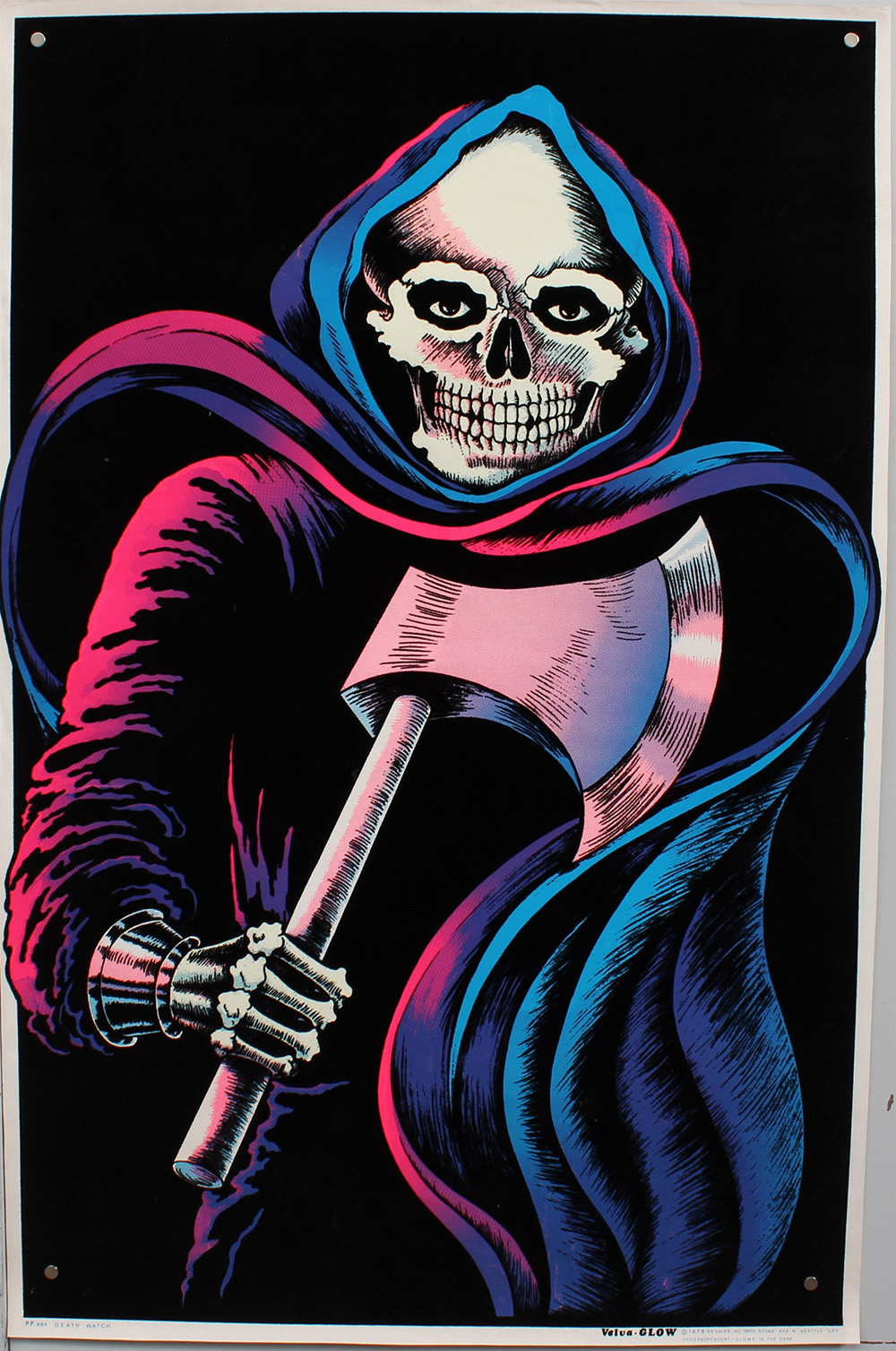 Lotto composto da due poster raffiguranti un cobra e uno scheletro incappucciato con falce (cm 88x57)editi dalla Velva-Glow,1978 Seattle. Entrambi con parti in velluto e fosforescenti al buio.