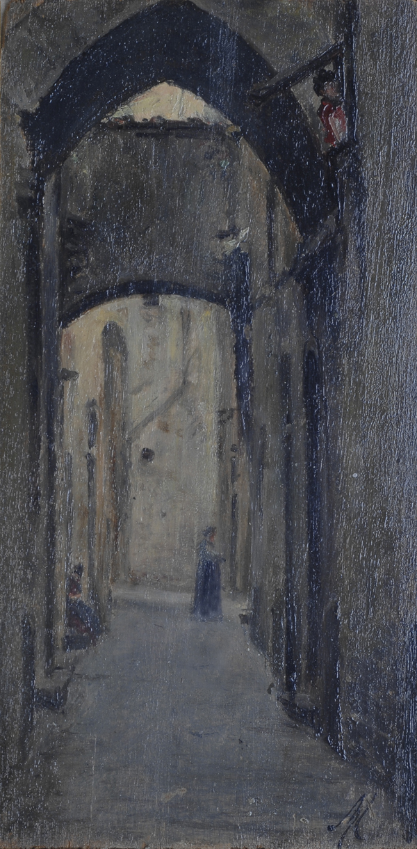 Anonimo del XX sec. Vicolo Olio su compensato, cm. 12,5x8 Sigla in basso a...