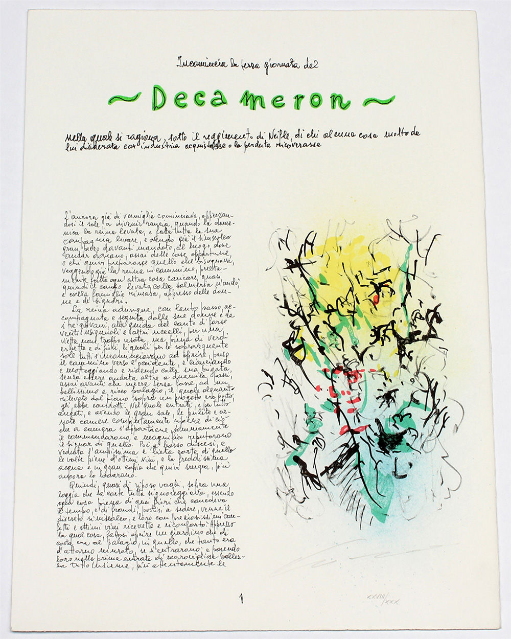 "Senza titolo" litografia (foglio cm 47,5x35) numerata XXVIII/XXX e firmata in basso a destra a matita. Stampata sul lato destro del fronte di un quartino ad illustrazione del Decameron di Boccaccio (le seconde venti novelle) Edizioni Teodorani, Milano, 1986/87