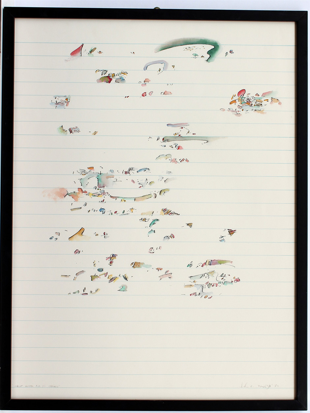 "Short work for 15 strings" 1972, tecnica mista su carta (cm 73x54,5). Titolata in basso a sinistra, firmata e datata in basso a destra, in cornice