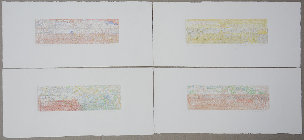 "Senza titolo" lotto composto da quattro acquaforti acquerellate - prove d'artista (lastra cm 6x19,5; foglio 16x35) iscritte, firmate in basso a matita, una datata 1977. Timbro a secco in basso a destra (lievi difetti)